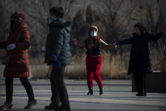 People wearing face masks to curb the spread of the coronavirus dance at a public park in Beijing, as parts of the neighbouring Hebei province have been classified a coronavirus high danger zone.Credit:AP