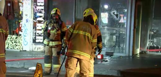 Victoria Police say emergency services were called to Smith Street in Melbourne’s inner north after a trio broke into a shop and started a fire, before fleeing in a silver SUV just before 3am.