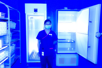 Pharmacist Lei Ching Yeoh in the vaccination hub at Sunshine Hospital in the Melbourne suburb of St Albans. Ultra-low temperature freezers there will store thousands of doses of the Pfizer vaccine as soon as it lands in Australia.Credit:Justin McManus
