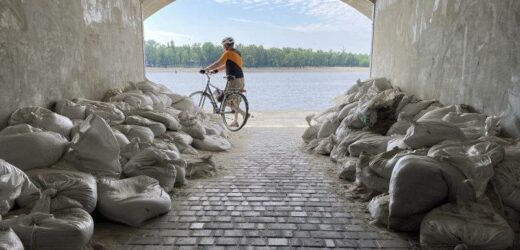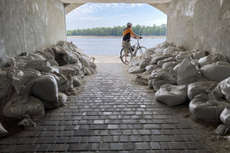 A Sunday morning cyclist emerges from a sandbagged tunnel next to the Dnipro River in Kyiv, Ukraine, earlier this month. Britain says Russia has troops stationed near the river close to the city of Kherson.Credit:AP