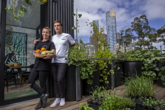 Our home for three months: Chefs Matt Stone and Jo Barrett at the sustainable house at Federation Square called Greenhouse By Joost.Credit:Wayne Taylor