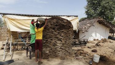 Villagers pile up cow dung to prepare cow dung cake, used as fuel, at Ganeshpur village, Uttar Pradesh state, India.Credit:AP