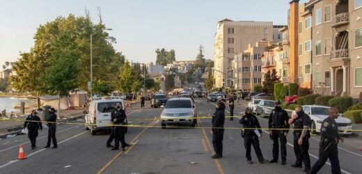 In this Saturday, June 19, 2021, photo, officers work the scene of a shooting in Oakland, Calif. (Dylan Bouscher/Bay Area News Group) (Dylan Bouscher/Bay Area News Group)