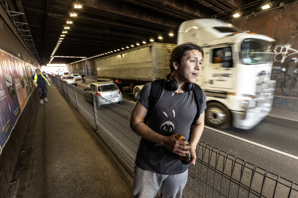 Mateo Flores on narrow pathway at the Tottenham underpass.Credit: Jason South