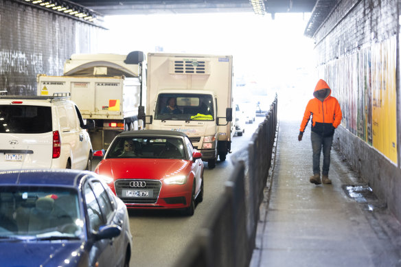 In Melbourne’s west, a narrow pedestrian underpass in Tottenham runs next to Sunshine Road, a busy arterial road used by trucks and cars.