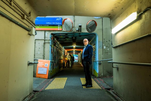 Victoria Walks executive officer Ben Rossiter at the Clifton Hill station underpass.Credit: Justin McManus