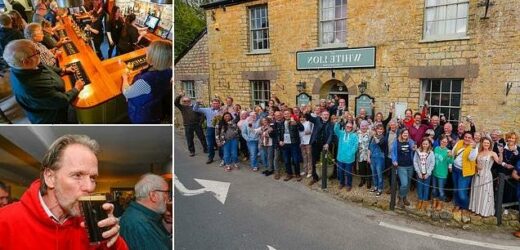 Enjoying the sweet taste of success: Dorset locals who raised £30,000 to save village’s last pub, after four others closed, celebrate with a pint as it reopens for first time over bank holiday weekend