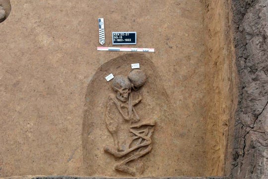 This photo provided by the Egyptian Tourism and Antiquities Ministry on Tuesday, April 27, 2021, shows an ancient burial tomb unearthed recently with human remains, in the Koum el-Khulgan archeological site, in the Nile Delta province of Dakahlia, around 150 kilometers (93 miles) northeast of Cairo, Egypt. Archeologists unearthed 110 burial tombs in the ancient site in a Nile Delta province, the Tourism and Antiquities Ministry said on Tuesday. (Egyptian Tourism and Antiquities Ministry via AP) (Photo: AP)