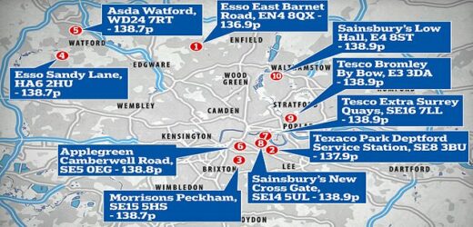 Others can be found in South East London, including the Applegreen Camberwell Road at 138.8p, and Tesco Extra Surrey Quays and Sainsbury’s New Cross Gate, both at 138.9p.