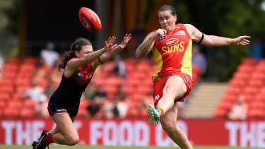 Gold Coast Suns player Sarah Perkins shows off her clean foot skills in the opening round.Credit:Getty Images