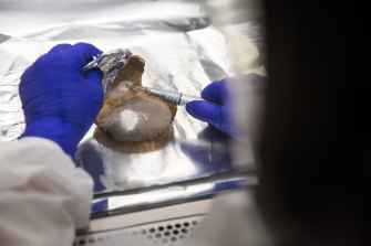 Technician drills into a skull to retrieve DNA at the Harvard geneticist David Reich’s lab in Boston.Credit:Kayana Szymczak/The New York Times