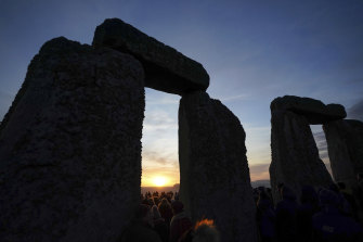 Many mysteries to Britain’s origins. The sun rises behind the Stonehenge prehistoric monument as people gather for the winter solstice celebrations, in Wiltshire, England, on Wednesday.Credit:PA/AP