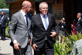 European Council President Charles Michel and Australian Prime Minister Scott Morrison arrive for a plenary session of the G7 summit in Cornwall, south-west England on Sunday.Credit:Getty Images