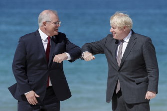 Prime Minister Scott Morrison and British Prime Minister Boris Johnson in Cornwall for the G7 summit.Credit:AP