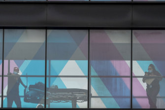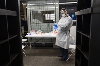 A medical worker waits at a COVID-19 testing site in the Times Square subway station in New York.Credit:AP
