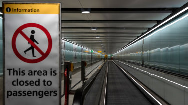 An airline passenger walks through an underpass between terminal buildings at Heathrow Airport on in London, England. Credit:Getty