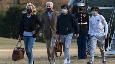 President Joe Biden and first lady Jill Biden with their grandchildren Hunter Biden, walk on the South Lawn upon arrival at the White House in Washington from a weekend trip to Wilmington, Delaware. Credit:AP