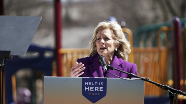 First lady Jill Biden speaks at a playground outside of the Samuel Smith Elementary School in Burlington, New Jersey.Credit:AP