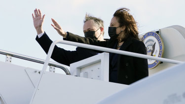 Vice-President Kamala Harris and her husband, Doug Emhoff, wave as they board Air Force Two at Andrews Air Force Base, Maryland. Credit:AP