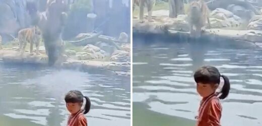 TERRIFYING video shows the moment a huge white tiger stalks an unsuspecting little girl before he makes a giant leap towards her.