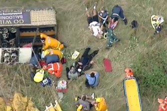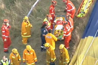A person is put on a stretcher after the hot air balloon crash in the Yarra Valley on February 8, 2018.Credit:Nine News