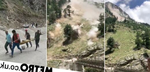 This is the horrifying moment a devastating rockslide which killed at least nine people destroys a bridge in northern India.