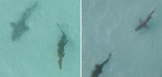 THIS is the incredible moment a shark stalks a crocodile in a battle of ultimate apex predators.