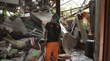 A rescuer inspects a damaged house at a village hit by a landslide in Nganjuk, East Java.Credit:AP