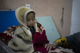 Guldana, 2 and malnourished, sits on a bed in the Indira Gandhi hospital in Kabul, Afghanistan, on Monday.Credit:AP