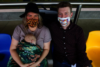 Sarah McKenzie and Matthew Bourke with their baby Finley Bourke in the grandstand.Credit:James Mepham