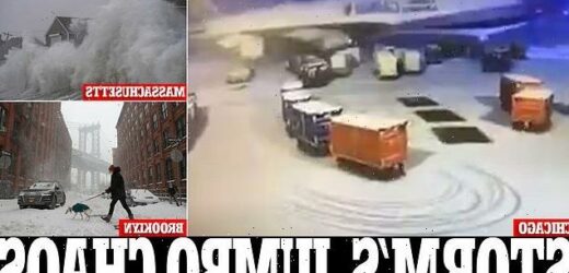 Video has emerged of the terrifying moment a large cargo jet skid off the runway and crashed into cargo bins at Chicago’s O’Hare Airport as a storm began pummeling the Northeast and New England, grounding thousands of flights and creating extreme hazards for road travel.