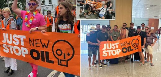 A Just Stop Oil banner stolen by a stag party has survived a heavy weekend in Ibiza and is headed back to the UK. Charlie Pearce (centre, in green) and his friends are pictured with the stolen banner at the airport in Ibiza