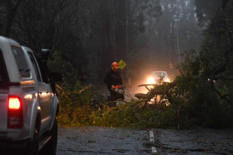 SES and CFA volunteers cleared trees throughout the night from the winding roads of the Dandenong Ranges.Credit:Joe Armao