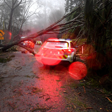 A fallen tree delays emergency service workers in Olinda.Credit:Joe Armao