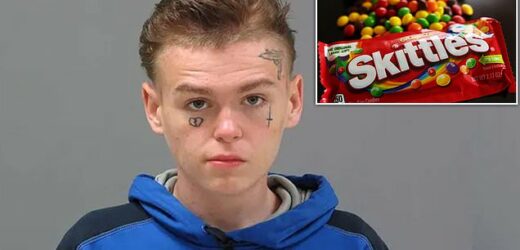 - He ‘began yelling and throwing Skittles at employees and customers, including hitting on in the back and leaving a ‘stinging pain’