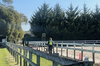 Police at the Connewarre scene where a 34-year-old man died in a skydiving accident on Sunday.Credit:Elisabeth Moss/Nine News
