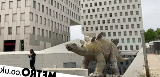 The father was able to spot the corpse through a crack in the Stegosaurus’s leg and called police.
