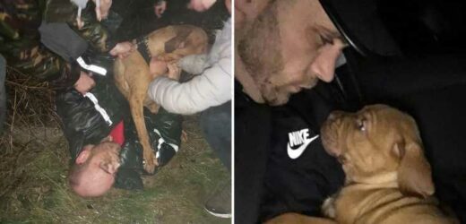 After six days the one-year-old puppy was found by Danny Moor and other volunteers lying in ditch two miles away from home, wrapped in barbed wire.