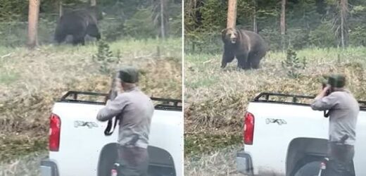 Terrifying moment a grizzly bear seeking his mate charges a Yellowstone Park ranger who fires projectiles and scares him off – prompting more reminders that people should NOT bother bears