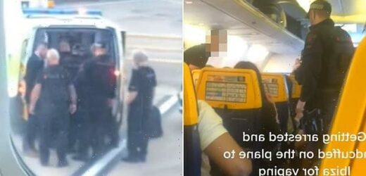 This is the moment a ‘drunk’ airline passenger is removed from a Ryanair flight to Ibiza by two armed officers after vaping on board.