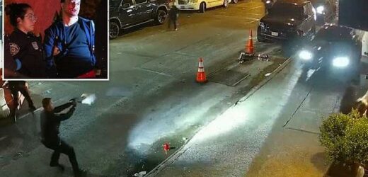 Dramatic moment NYPD officers opened fire on ‘Own Every Dollar’ gang members driving BMW as they mounted curb and tried to flee during hunt for robbers who stole $4M from wealthy NYC restaurant diners eating outside