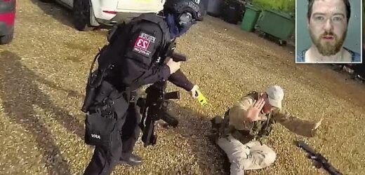 Moment police officer blasts paedophile with rubber bullet as he brandished fake assault rifle outside village pub