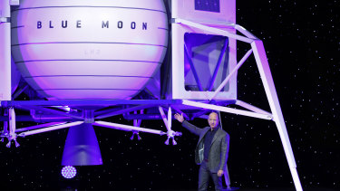 Jeff Bezos in front of a model of Blue Origin’s Blue Moon lunar lander on Thursday.Credit:AP