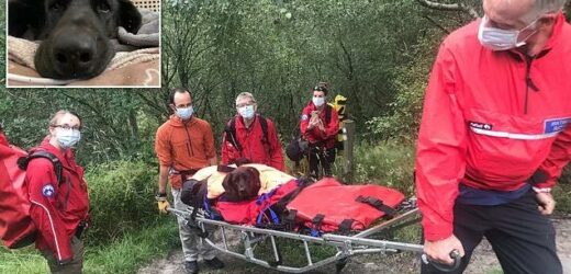 Paw Patrol! Mountain rescue team STRETCHER Jess the brown Labrador safely down off hilly terrain, after stranded dog, 11, became ill on her afternoon walk and was too heavy for her owner to carry home