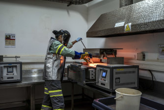 Marie-Michele Robert-Agourere, a laboratory technician, tests samples at the Prony Resources nickel mine processing plant in Goro.Credit:Adam Dean/The New York Times