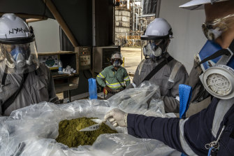 A worker takes a sample of processed nickel at the Prony Resources nickel mine plant in Goro, New Caledonia.Credit:Adam Dean/The New York Times