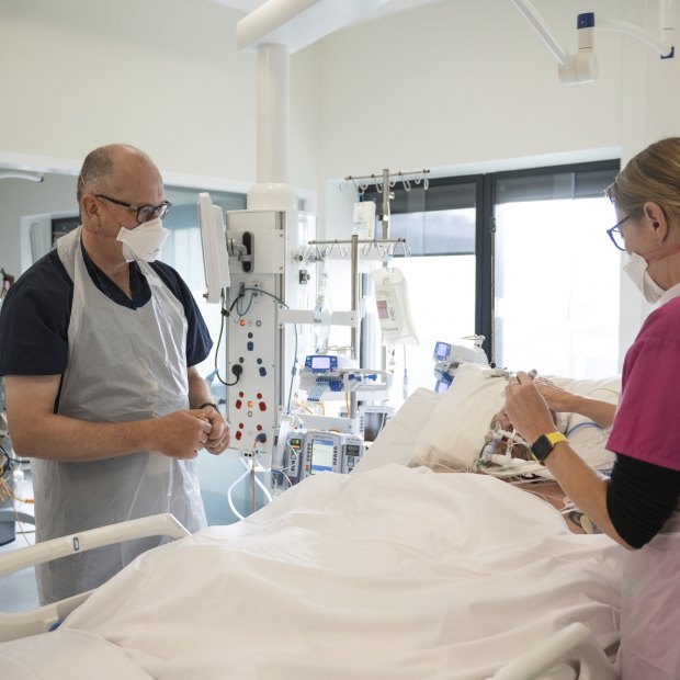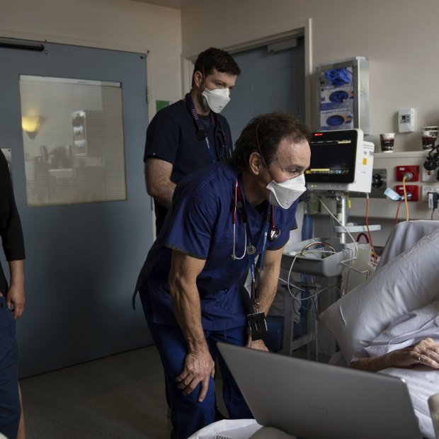 Intensive care director Chris MacIsaac checks a patient with other staff.Credit:Penny Stephens