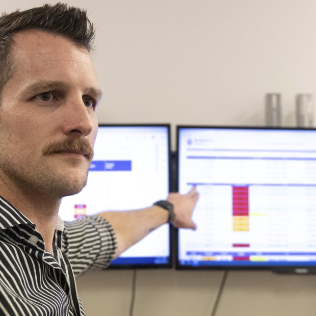 ‘A big mismatch’: Manager of access and patient flow Sam Strapps in his office at the Royal Melbourne Hospital in Parkville. Credit:Penny Stephens