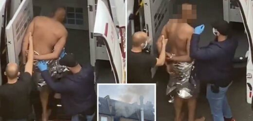 A NAKED man was arrested after a fleeing a house engulfed by flames following an explosion that injured a police officer.