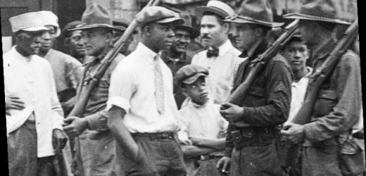 A crowd of men and armed National Guard stand in front of the Ogden Cafe during race riots in Chicago in the Red Summer of 1919. Credit:AP